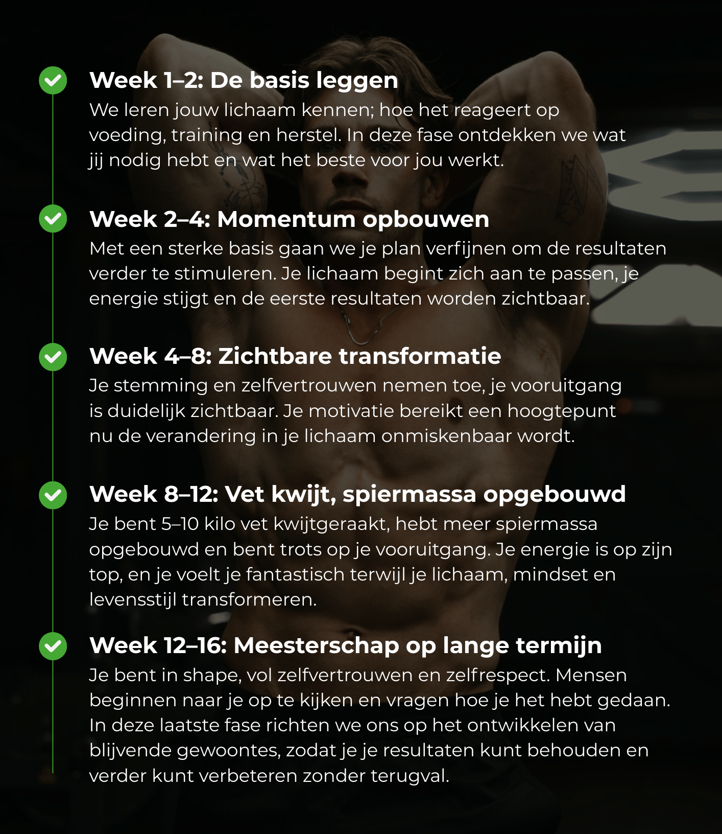Wekelijkse check-ins en aanpassingen aan je strategie om de beste vooruitgang te garanderen.